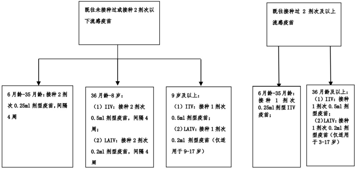 6 月龄-8 岁儿童:首次接种或既往接种 2 剂次以下流感疫苗 的 6 月龄-8 岁儿童应接种 2 剂次,间隔≥4 周;2020-2021 年度或以前接种过 2 剂或以上流感疫苗 的儿童,则建议接种 1 剂