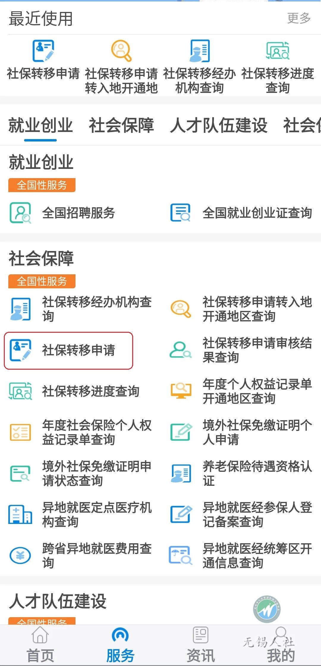 三、申请人在“社会保障”下方点击“社保转移申请”。