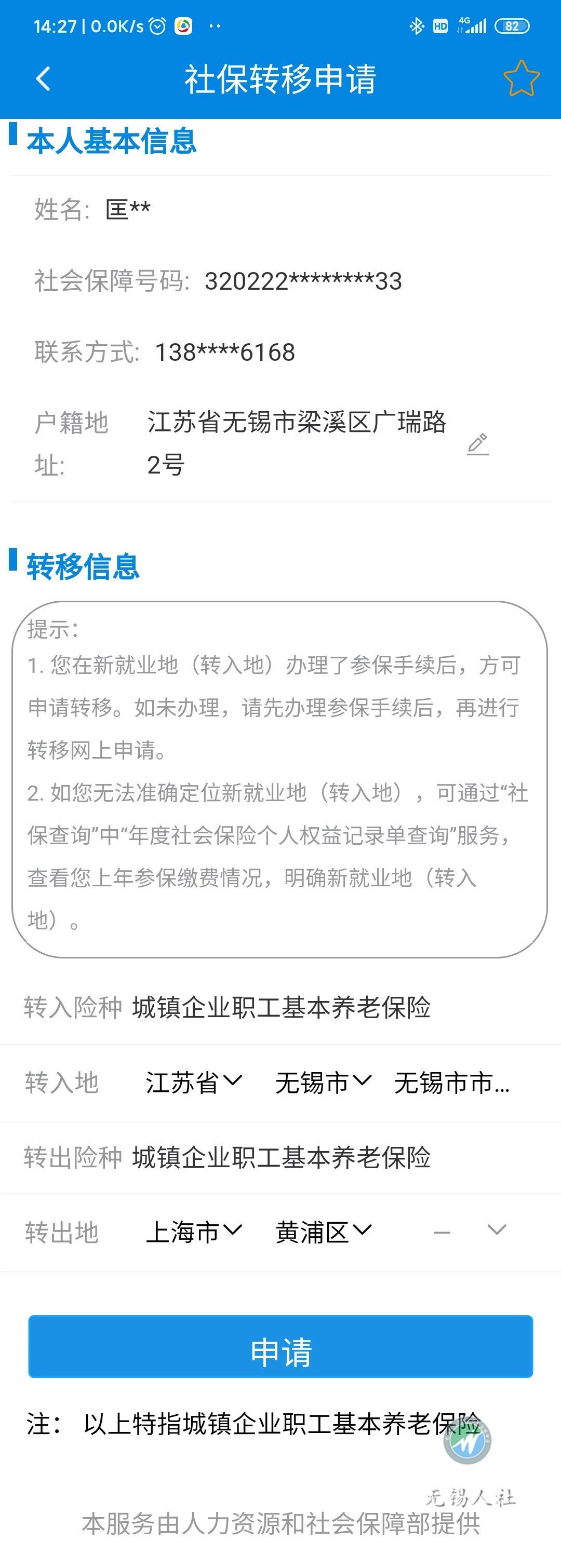 六、申请人填写“本人信息”和“转移信息”并提交申请。