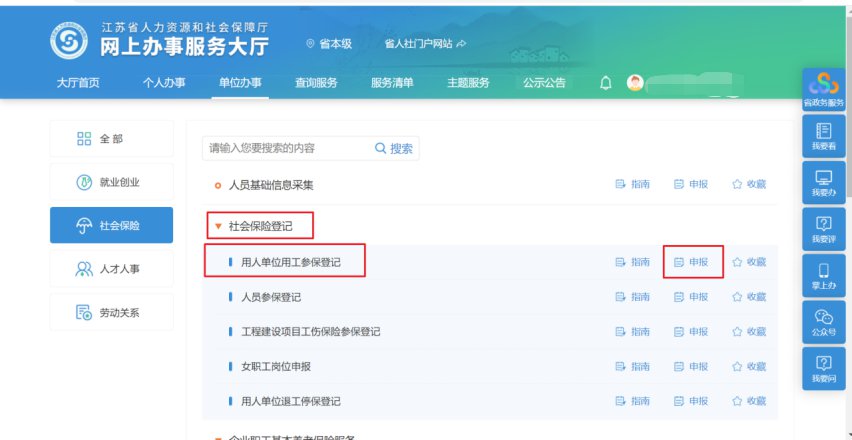 2.点击“社会保险登记”,点击“用人单位用工参保登记”对应的【申报】按钮