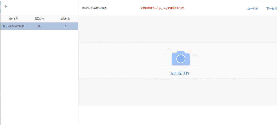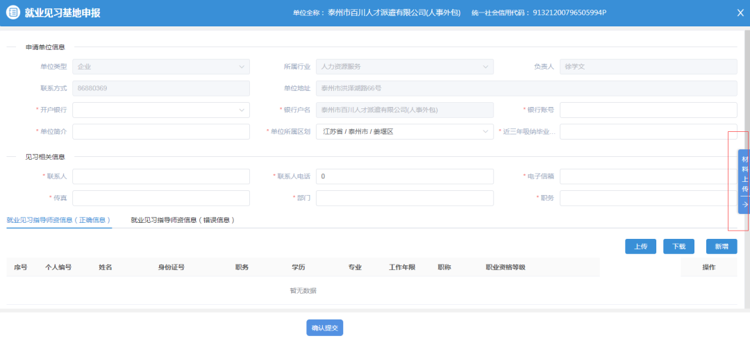 第五步:上传盖章的《就业见习基地申请表》纸质盖章件、就业见习制度、劳动安全制度(对应附件名称:相关管理制度文件),点击确认提交