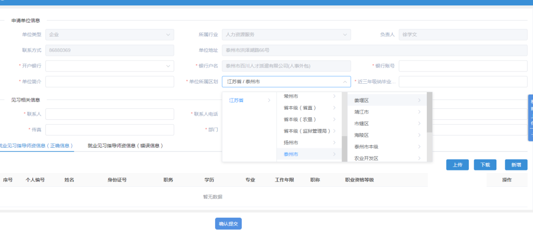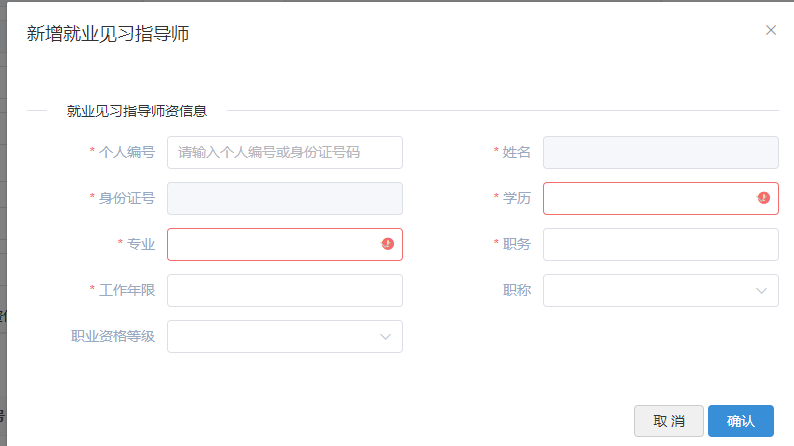 输入身份证号码自动就匹配出其他相关基础信息(见习指导老师一定是该单位的参保人员,否则录入不进来。)