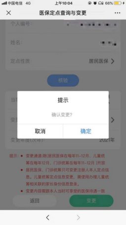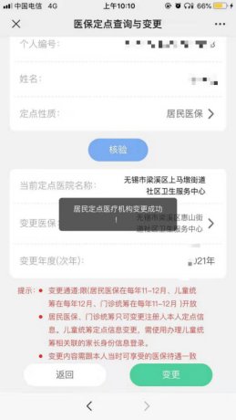 5、如需变更定点医院,则点击”变更医保”,选中新定点医院名称,再点击“变更“按钮即完成定点变更手续,次年可到新定点医院就诊。
