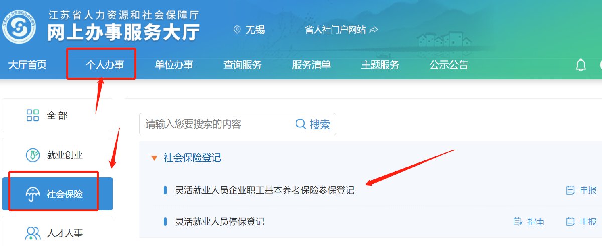 ③APP申请:下载“江苏智慧人社”APP-个人注册登录(请将页面上方、搜索栏旁的城市修改为“无锡”)-“全部”-“社会保险”-“灵活就业人员企业职工基本养老保险参保登记”中申请办理。