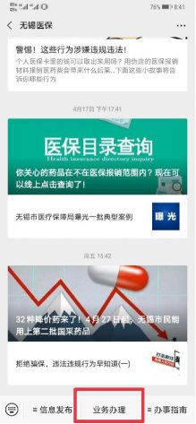 第一步:关注“无锡医保”微信公众号,点击“业务办理”