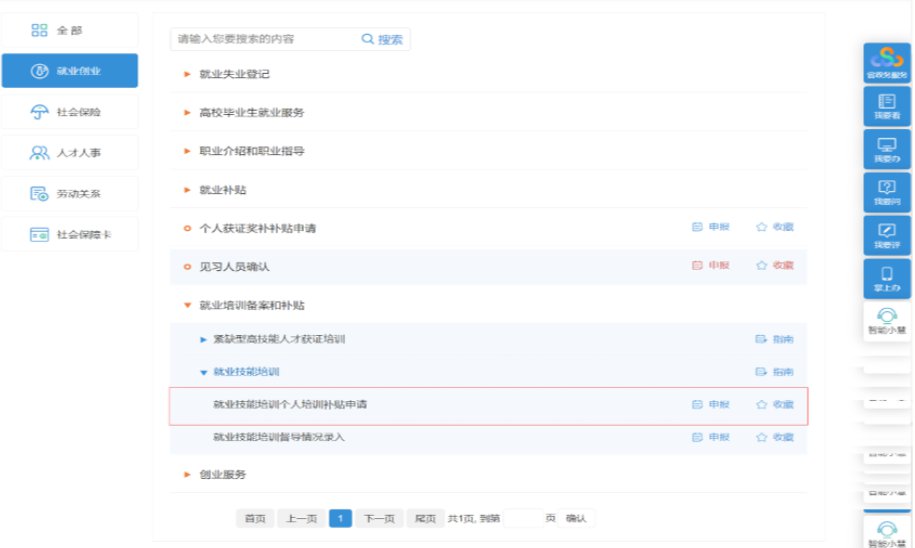 选择个人办事→就业创业→就业培训备案和补贴→就业技能培训→就业技能培训个人培训补贴申请。