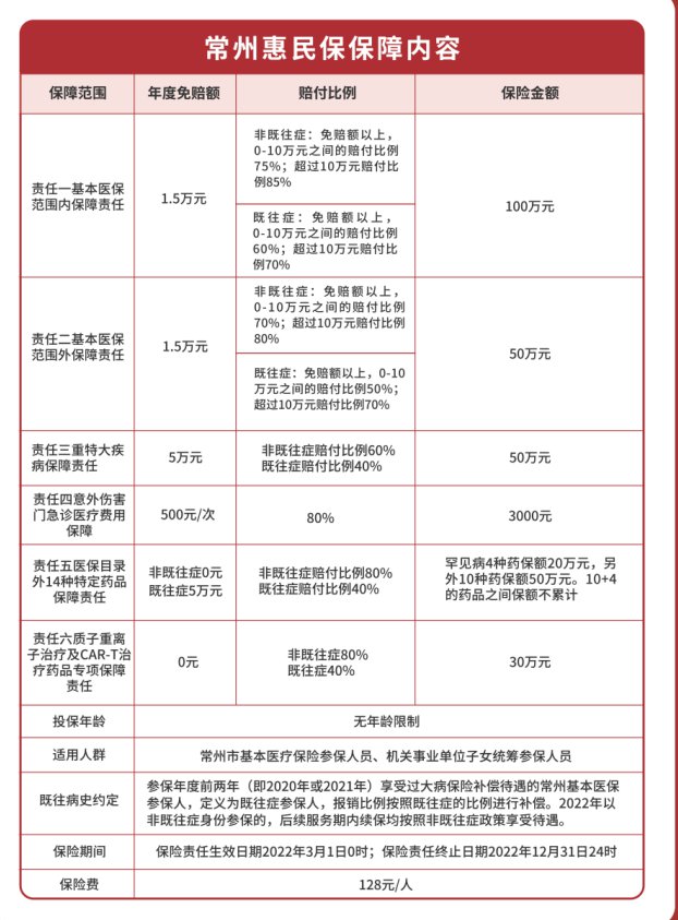 2022常州惠民保价格更优惠,128元/人,享最高300万保障,具备6大保险责任,保障内容更加