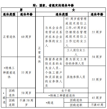 注:*特殊工种提前退休的条件是指符合国务院国发〔1978〕104 号文件规定从事井下、高温、低温、高空、特别繁重体力劳动或者其他有害身体健康工作并达到规定年限。*病退的条件是指因病或者非因工致残,经设区的市级以上劳动能力鉴定委员会确认,完全丧失劳动能力。