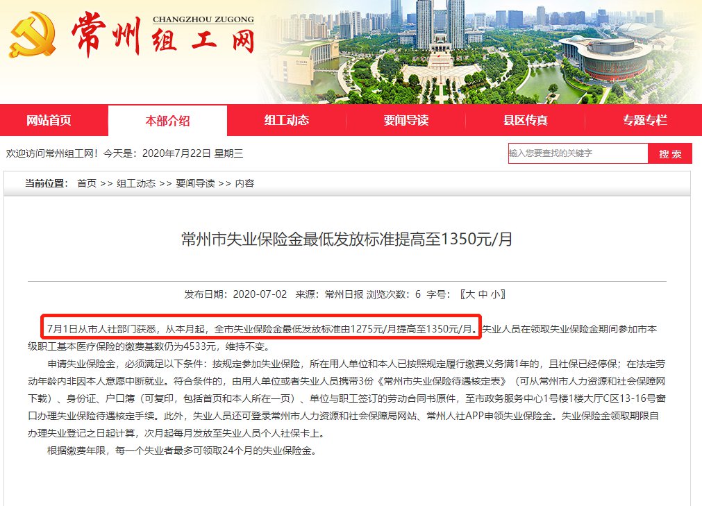 从2020年7月1日起,常州市失业保险金最低发放标准由1275元/月提高至1350元/月。