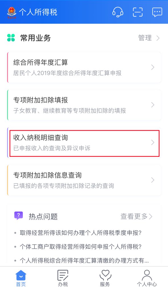在首页依次点击【常用业务】-【收入纳税明细查询】,纳税记录年度自动选择“2020年”,可查看2020年度的“工资薪金”、“劳务报酬”、“稿酬”、“特许权使用费”四项综合所得的“收入合计”、“已申报税额合计”。