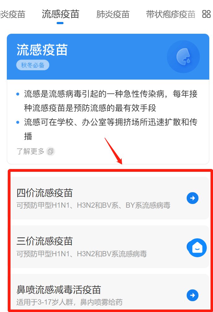 2、进入流感疫苗预约界面,可以首先了解流感疫苗接种针次和适用年龄,然后选择自己需要预约的疫苗类型;