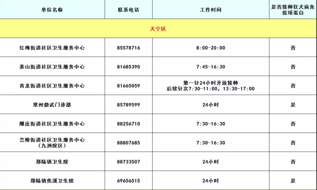 常州天宁区狂犬病暴露预防处置门诊名单