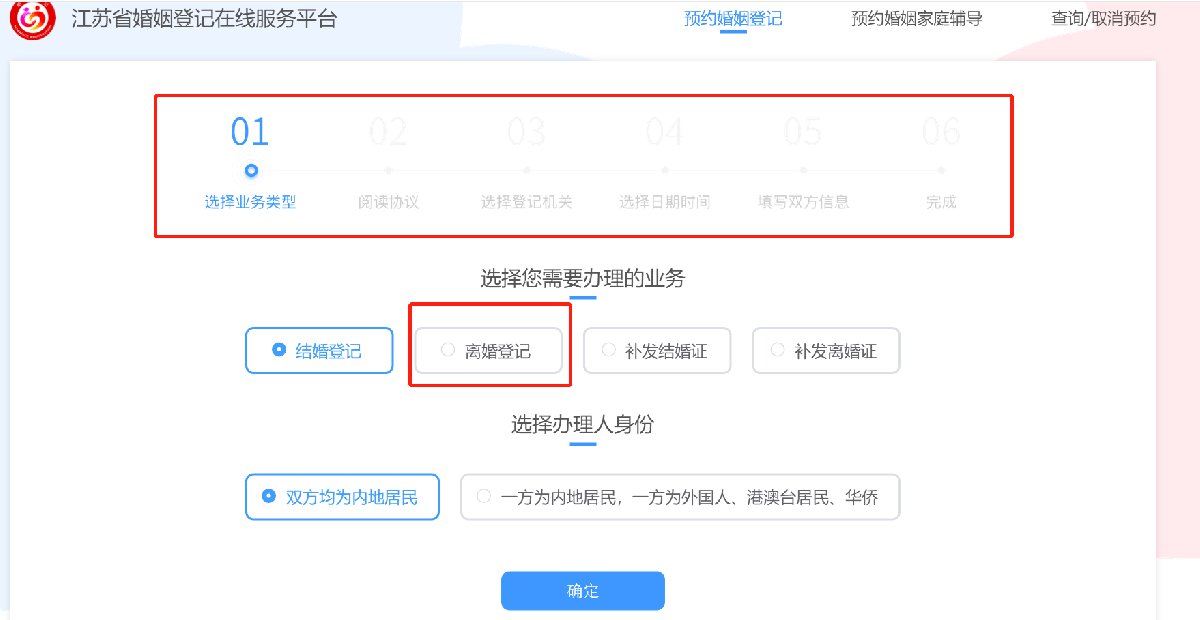 点阅读预约须知,点击开始预约,点击离婚登记,进入登记窗口,输入当事人双方信息,根据提示系统提示完成预约