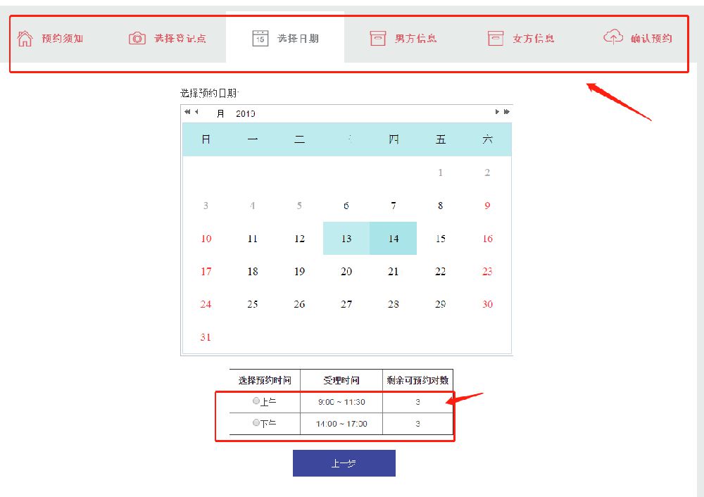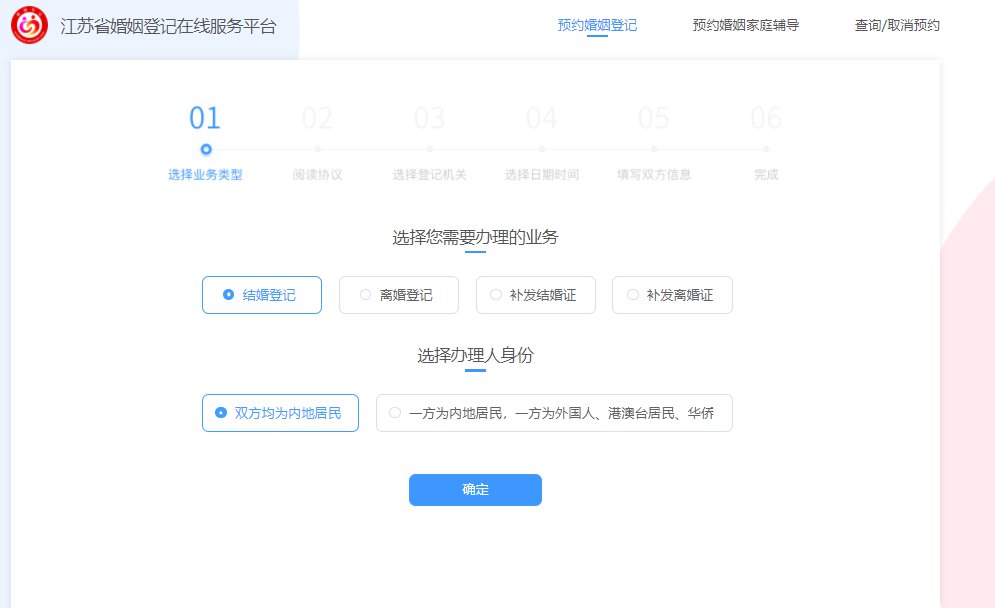 流程:选择身份-阅读协议-登记机关-选择日期-填写双方信息-完成