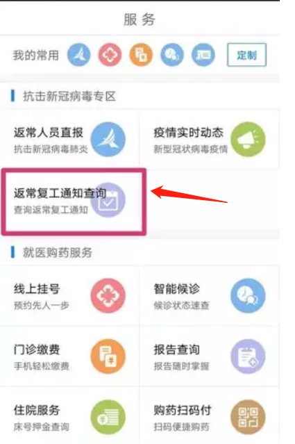 点击首页底部“服务”按钮进入服务页面,在页面上方“抗击新冠病毒专区”点击“返常复工通知查询”即可进入返常复工通知查询页面。
