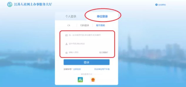 1.进入江苏人社网办大厅https://rs.jshrss.jiangsu.gov.cn/web/login,选择单位登录,点击登录或注册。
