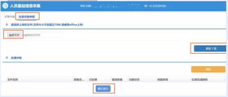 选择“人员基础信息采集”,点击 “批量采集申报”,下载模板后填写,上传材料并提交。