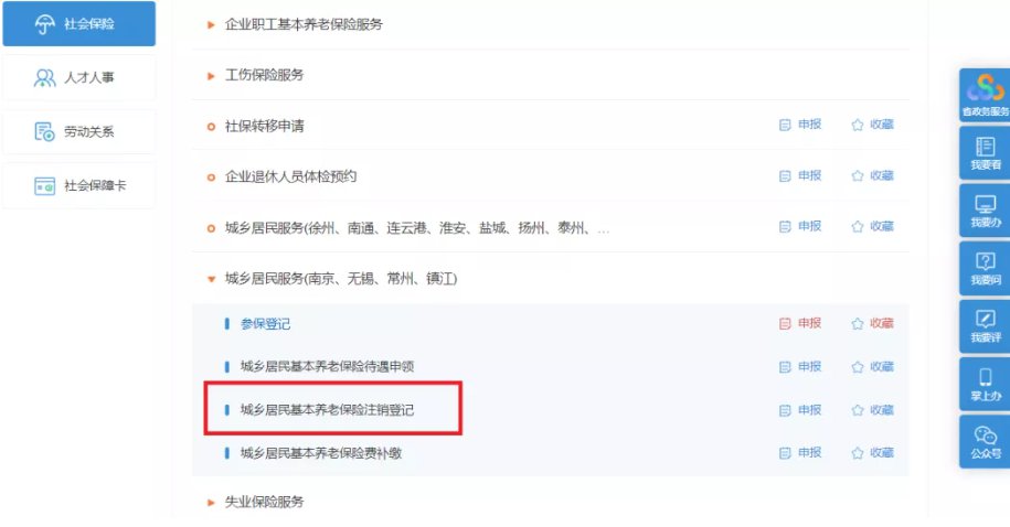 第三步:点击“城乡居民服务(南京、无锡、常州、镇江)”按钮,选择“城乡居民基本养老保险注销登记”。点击“申报”进入办理界面。上传材料并提交,即办理完成。