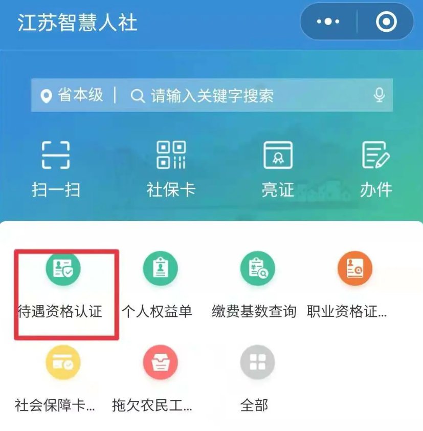 打开“江苏智慧人社”,首页点击“待遇资格认证”: