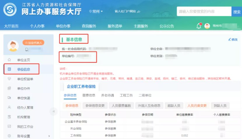 1.网办单位用户登录江苏省人力资源和社会保障厅 “网上办事服务大厅” (https://rs.jshrss.jiangsu.gov.cn/index/),点击右上角单位名称,进入“单位中心”,左侧菜单栏中点击 “单位信息”,在 “基本信息”中获取单位社保编号。(特别提醒:请参保单位提前在网厅注册账密用户)