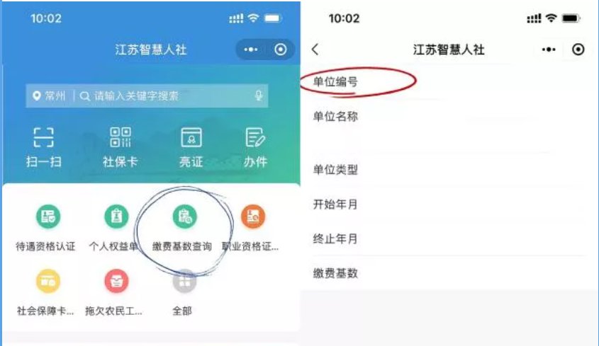3.参保人员下载(搜索)“江苏智慧人社”APP(微信公众号)、“常州人社”APP(微信公众号),注册实人用户后,在首页“缴费基数查询”中获取单位社保编号。