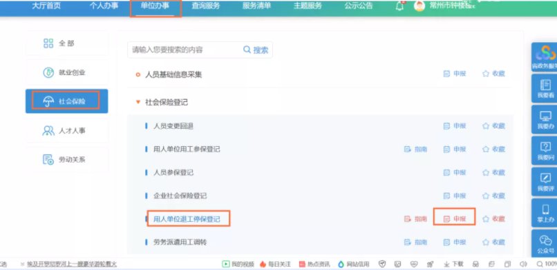 选择“社会保险登记”,选择“用人单位退工停保登记”,点击“申报”。