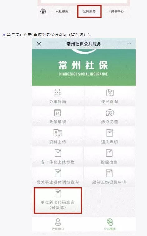 关注“常州社保”微信公众号后,进入“公共服务”界面。第二步:点击“单位新老代码查询(省系统)”。