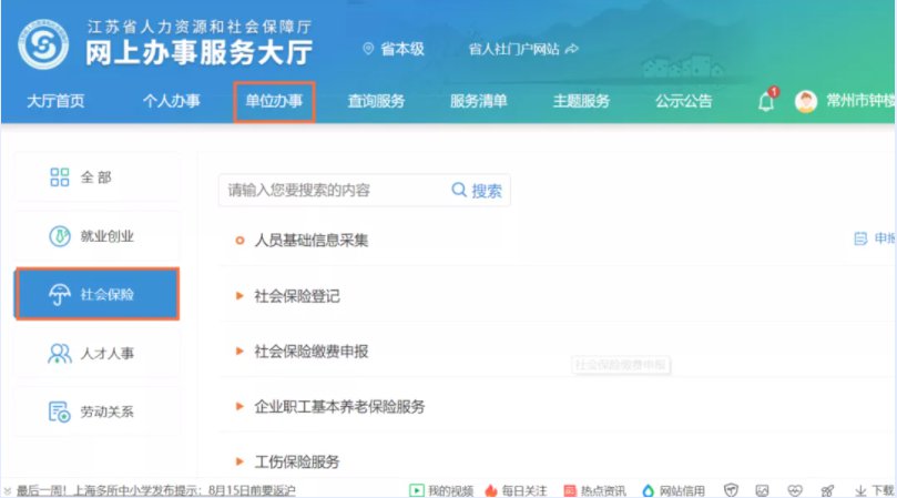 单位登录网站之后,选择“单位办事”,点击“社会保险”模块。
