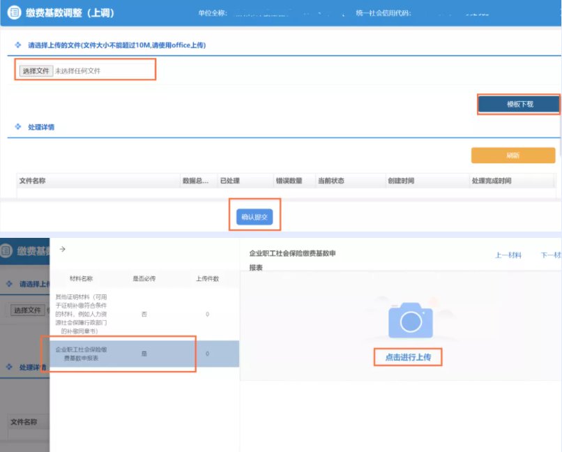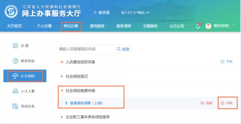 点击“社会保险缴费申报”,选择“缴费基数调整(上调)”,点击“申报”。