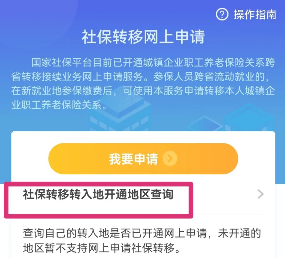 4、选择“社保转移转入地开通地区查询”,可查询经办机构是否开通网上申请服务;也可通过“社保转移经办机构查询”查询各地经办机构办公地址和联系方式;