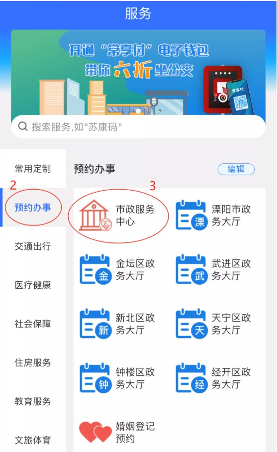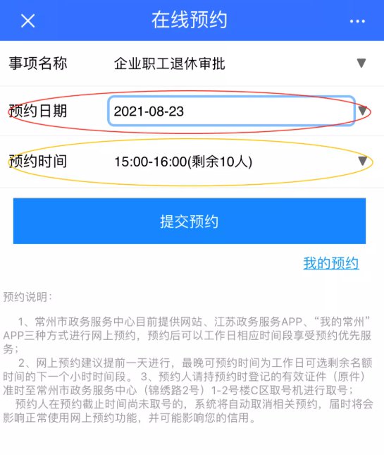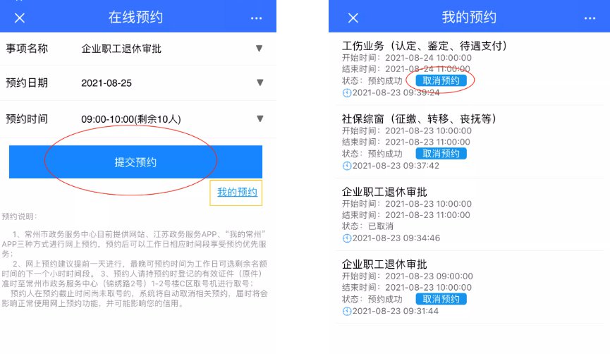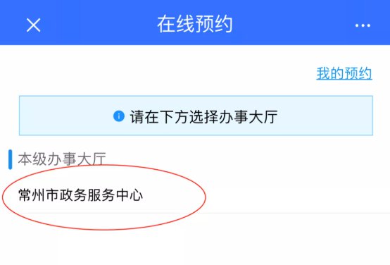 您也可以通过“江苏政务服务”APP或“江苏政务服务网”在线预约,进入首页后找到“在线预约”进入“常州市- 市级”进行上图操作预约即可。