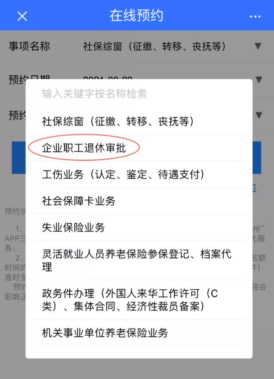 第五步,在事项名称中选择您要办理的事项,如“企业职工退休审批”