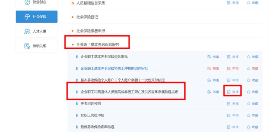 点击“企业职工基本养老保险服务”,选择“企业职工和离退休人员因病或非因工死亡及供养直系亲属待遇核定”,点击“申报”。
