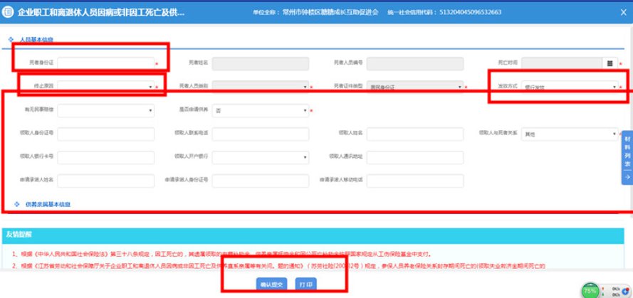 输入死亡人员身份证信息,选择终止原因,发放方式选择“银行发放”,并输入相应的银行信息,上传相关材料,最后点击“确认提交”、“打印”。