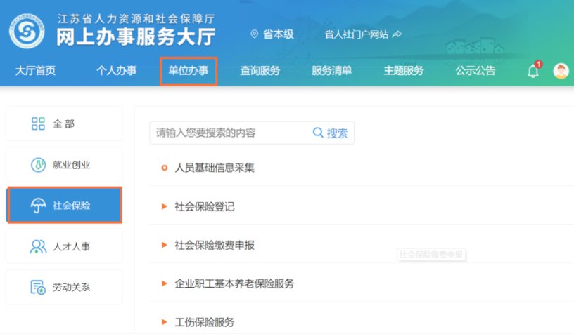 单位登录网站之后,选择“单位办事”,点击“社会保险”模块。