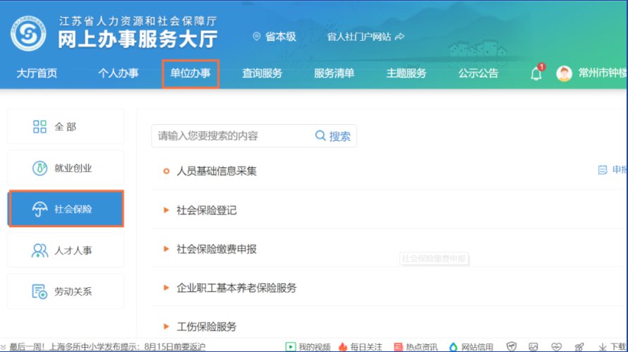 单位登录网站之后,选择“单位办事”,点击“社会保险”模块。