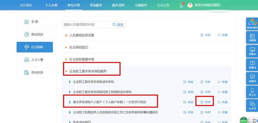 点击“企业职工基本养老保险服务”,选择“基本养老保险个人账户(个人账户余额)一次性支付核定”,点击“申报”。