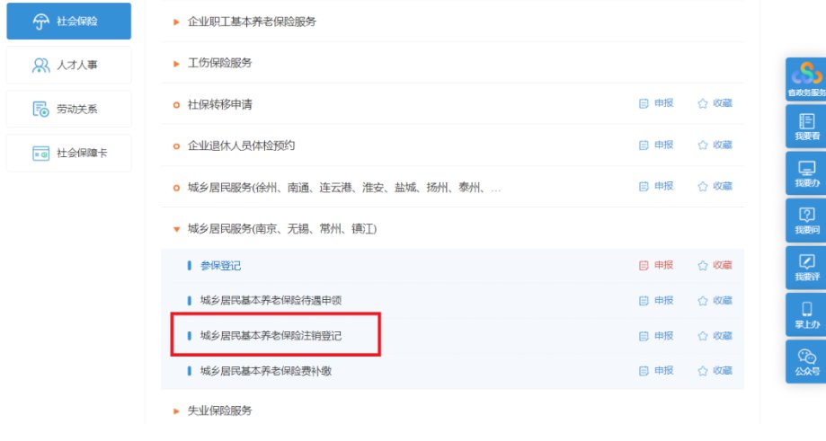 第三步:点击“城乡居民服务(南京、无锡、常州、镇江)”按钮,选择“城乡居民基本养老保险注销登记”。点击“申报”进入办理界面。上传材料并提交,即办理完成。