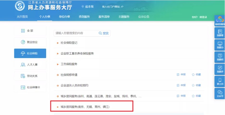 第二步:登录网站之后,点击“个人办事”,点击左侧的“社会保险”按钮,对应右侧会出现社会保险事项,选择城乡居民服务(南京、无锡、常州、镇江)。
