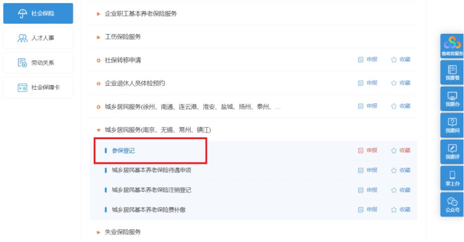 第三步:点击“城乡居民服务(南京、无锡、常州、镇江)”按钮,选择“参保登记”。点击“申报”进入办理界面。上传材料并提交,即办理完成。