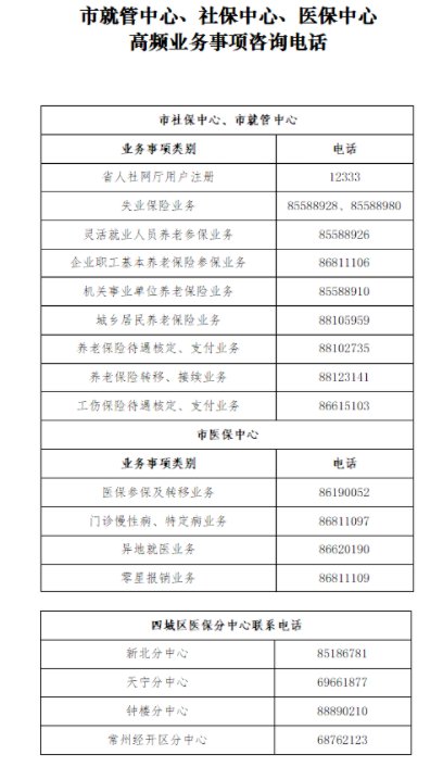 就业、社保业务:“江苏智慧人社”APP、“常州人社”APP、“常州人社”微信公众号及“常州社保”微信公众号。