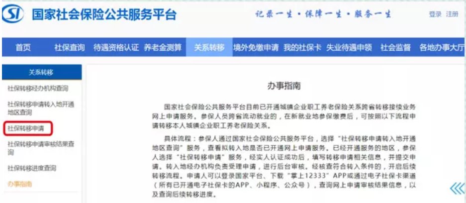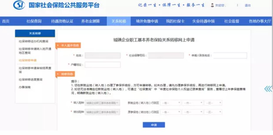在左侧功能栏中,选择“社保转移申请”栏目,如下图: