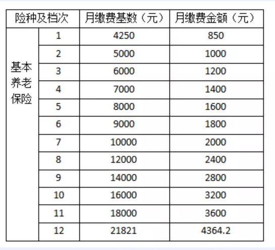根据上级文件规定,灵活就业人员自愿参加企业职工基本养老保险的,缴费工资基数分为十二档,依次为:4250元、5000元、6000元、7000元、8000元、9000元、10000元、12000元、14000元、16000元、18000元及21821元。广大灵活就业人员可自主选择适当缴费基数,缴纳职工养老保险费。