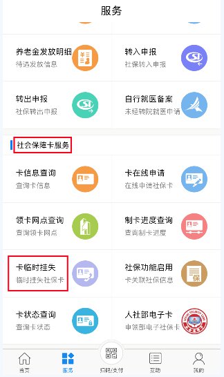 点击“服务”图标,找到“社会保障卡服务”点击“卡临时挂失”
