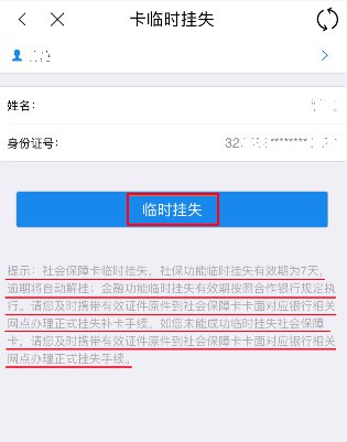 进入卡临时挂失界面后,请核实确认需要进行预挂失人员的身份信息,并仔细浏览提示,点击“临时挂失”