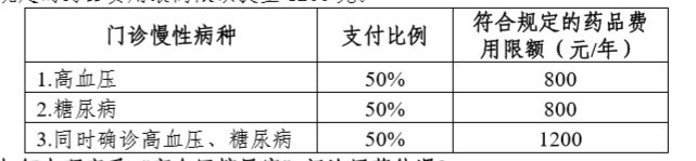 临床评估符合“两病”诊断标准,确需采取药物治疗的城乡居民参保人员,一个年度内在二级以下定点基层医疗机构发生符合医保规定的药品费用在最高限额 800 元以内的部分,由统筹基金支付 50%;同时患有高血压、糖尿病两种疾病的,符合 医保规定的药品费用最高限额提至 1200 元。