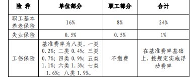 养老保险:基本养老保险24%,其中单位16%,个人8%(个体工商户及其雇工、灵活就业人员为20%,其中雇主12%,雇员8%)