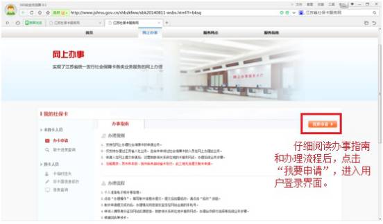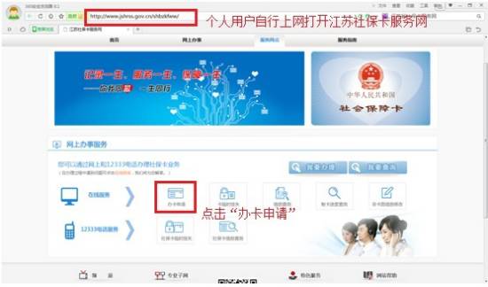 1、个人用户自行上网打开江苏社保卡服务网,点击“办卡申请”。