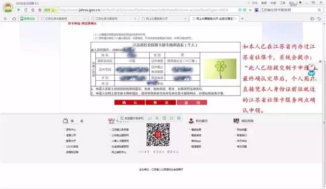 5、如本人已在江苏省内办过江苏省社保卡,系统会提示:“此人已提交制卡申请”。最终确认完毕后,个人用户直接凭本人身份证前往就近的江苏省社保卡服务网点确认申领。