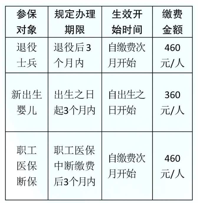 注:办理参保手续时,需持身份证/户口簿(原件及复印件)。退役士兵还需持“退伍证”(原件及复印件)、新出生婴儿还需持“村委/社区盖印的新生儿参保申请表”。